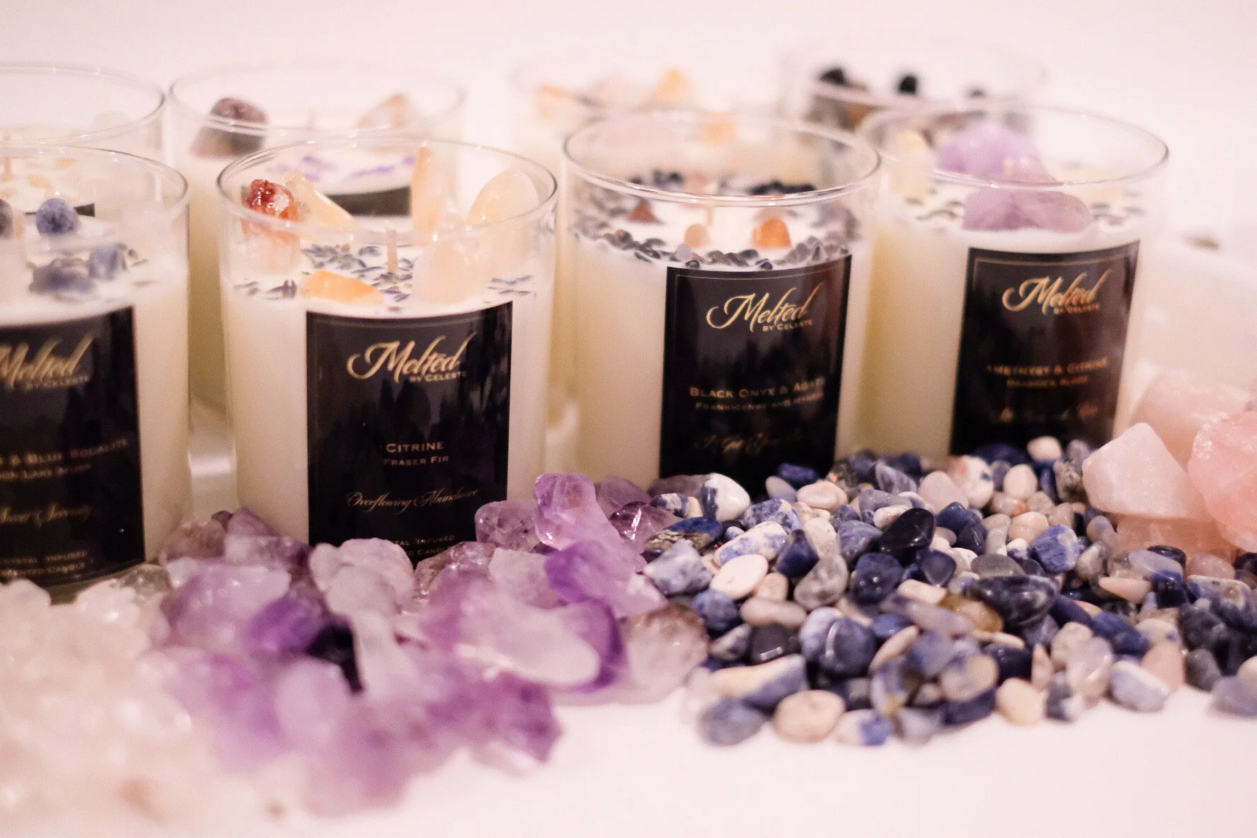 Melted by Celeste candles are made with 100% all natural Soy wax infused with energy from crystals.